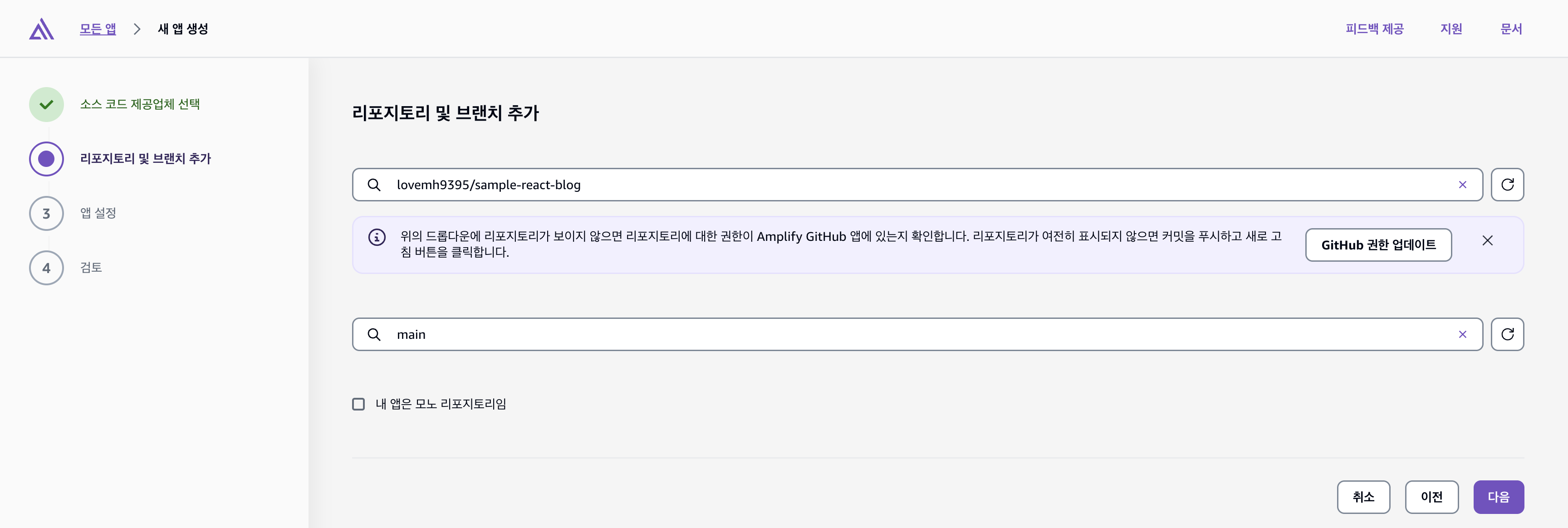 - 배포할 저장소와 브랜치 선택