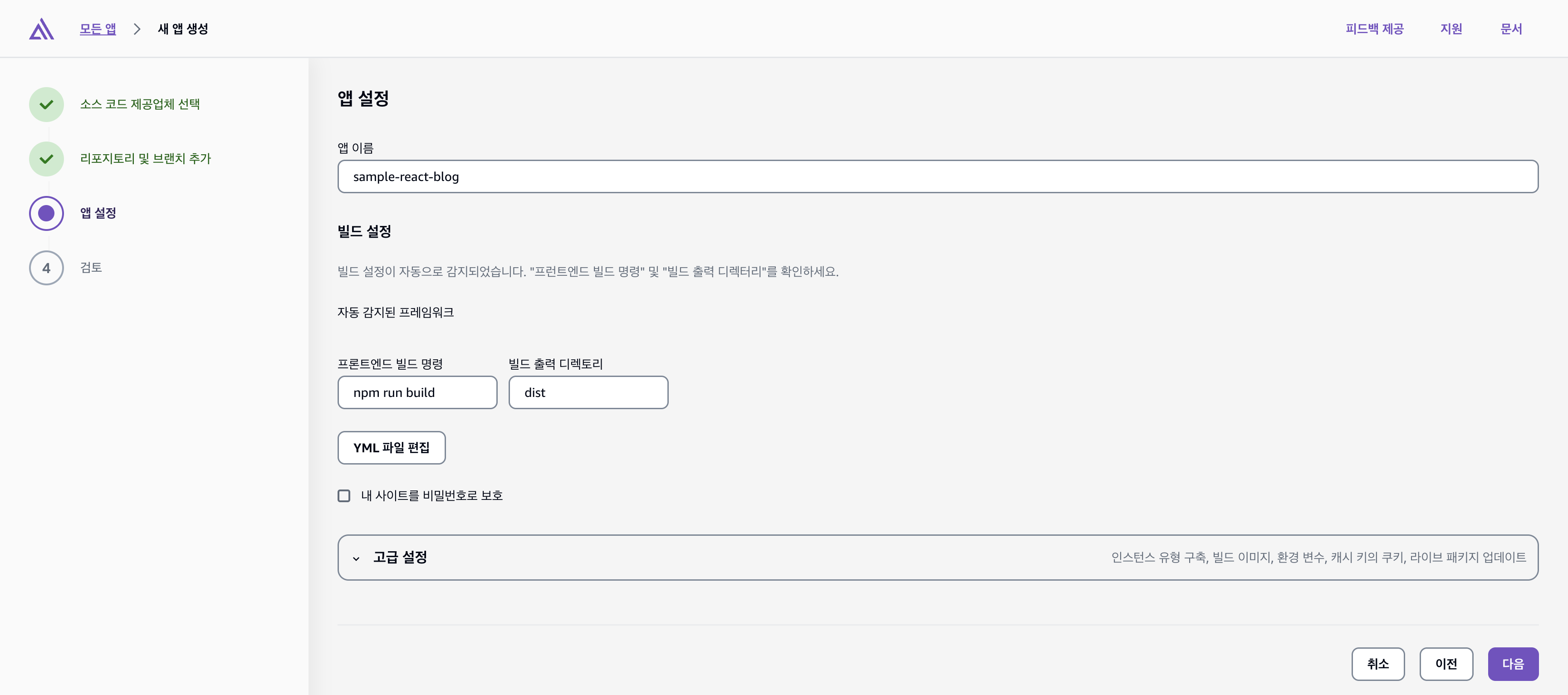 - Amplify가 자동으로 React 프로젝트를 감지하고, 기본 빌드 명령어(